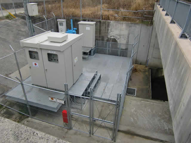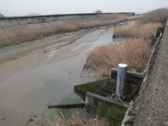 北九州空港へ向かう道路の橋の下で、朽網川と曽根干潟の境にあるポンプ施設です。