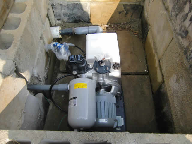 共同の温泉貯湯タンクより各戸にお湯を移送するポンプです。