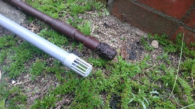 そして、揚水管(吸い込みパイプ)も引き上げ交換します。鉄分の1種のマンガン質が多いのでしょう、先端はほぼマンガンでふさがれています。