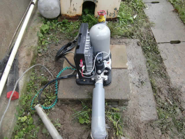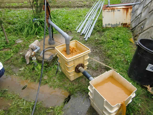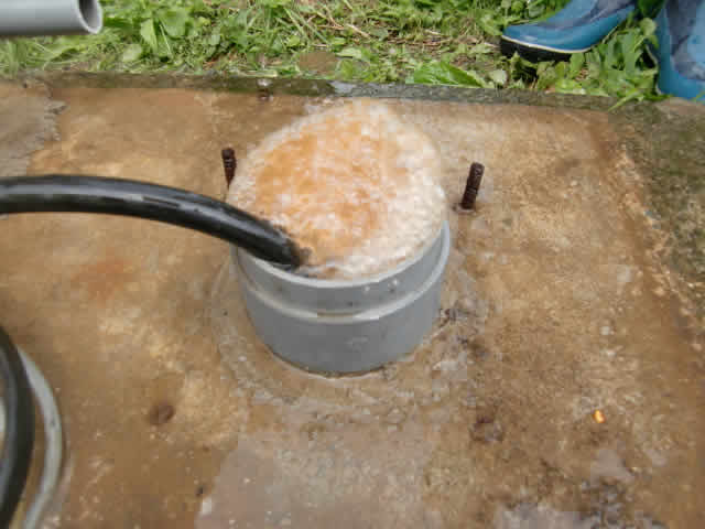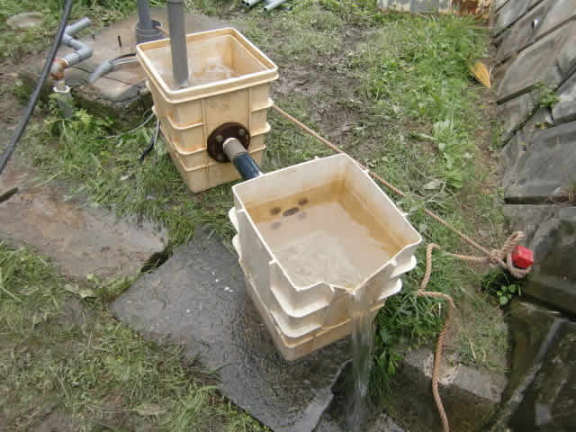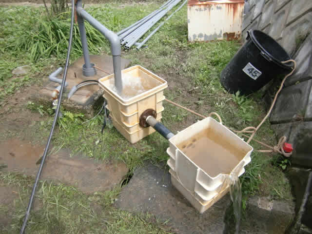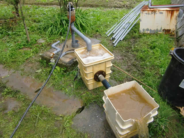 掃除用の揚水管を挿入した後、エアリフトで水替えですバッド(下向き矢印)バッド(下向き矢印)バッド(下向き矢印)